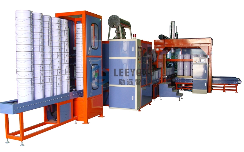 全自动码垛系统:全自动灌装机灌装好物料的包装桶经过密封包装,传递到自动堆垛机下。自动堆垛机通过机械手,将装满物料的包装桶准确吸取并放置到设定的托盘内。当托盘内桶的个数达到指定数目,机械手会自动将放置完桶的托盘运输到指定位置。此项技术不仅能让灌装节省了人工成本80%以上,减少了人为浪费和环境污染,同时增加了生产速度,整个灌装的过程变得更加轻松、准确。